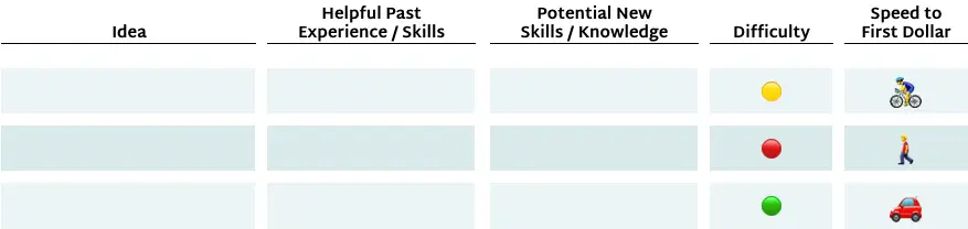 You can filter the 26 ideas in the worksheet by difficulty level and speed to first dollar